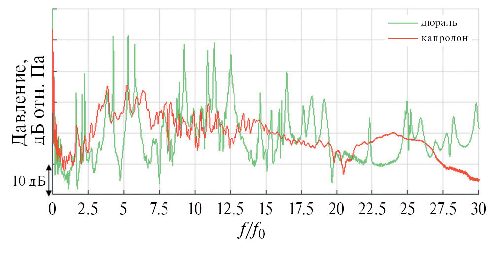 На рис. 10 изображено сравнение акустических откликов винтов в воде на ударное возбуждение при свободной подвеске. Измерение показывает, что для капролонового винта коэффициент затухания на нижних собственных формах 0.05, а для дюралевого винта — 0.004. Из-за большого затухания на высоких частотах резонансы капролонового винта перестают разрешаться и сливаются в широкополосные максимумы. Заметим, что величина падения добротности при переходе из воздуха в воду для разных материалов отличается почти в два раза и зависит от типа формы колебаний, т.е. излучение в среду для дюралевого винта существенно сказывается на суммарных потерях.