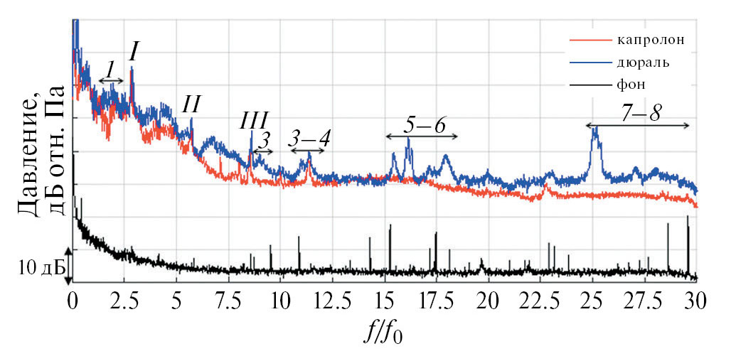 На рис. 11 представлено сравнение спектров давления для двух винтов (красная кривая — капролоновый винт, синяя — дюралевый винт), полученных при движении аппарата с частотой вращения вала 0.025 Гц на глубине 3 м. Как следует из сравнения с данными, представленными на рис. 10, резонансы лопастей капролонового винта не проявляются в сигнале. При этом на обеих кривых наблюдается набор гармоник (отмечены цифрами), зависящих от оборотов вала и не являющихся резонансами лопастей. Эти гармоники связаны с работой электропривода. Таким образом, измерения в условиях полигона демонстрируют возможность оценки уровней шума, виброакустических характеристик винтов и анализа вкладов различных источников. В частности, определения эффекта от использования материалов с разным уровнем внутренних потерь.