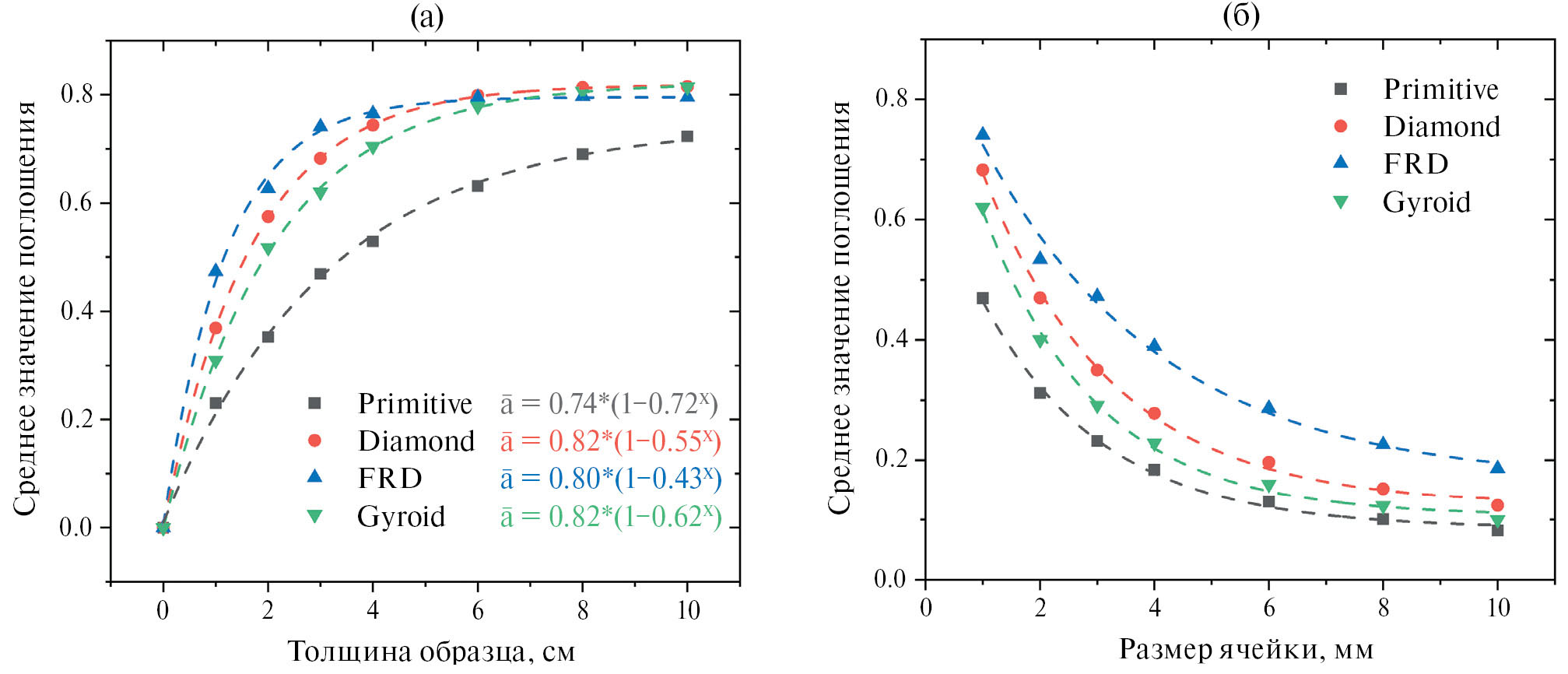 Было изучено влияние толщины материала на звукопоглощение для определения оптимальных размеров, при которых геометрия структуры вносит значительный вклад в акустическое поведение. В этом исследовании использовались все четыре топологии с одинаковой пористостью равной 0.5. Исходя из рис. 7а, в диапазоне толщин 1–4 см геометрия сильнее всего влияет на звукопоглощающую способность, а максимальная разница между FRD и Primitive на участке 2–3 см составляет 0.27. Начиная с 5 см для FRD начинается участок насыщения, звукопоглощение Diamond превалирует вплоть до 10 см, где влияние геометрии уже несущественно. При этой же толщине Gyroid сопоставим по среднему коэффициенту со структурой Diamond, которая вышла в насыщение с 8 см. В то же время, для геометрии Primitive участка насыщения не наблюдается, поэтому можно предположить, что при дальнейшем увеличении толщины материала его звукопоглощение будет преобладать над другими. Полученные значения хорошо интерполируются показательной функцией c коэффициентом детерминации R2 ≈ 1. Варьируя толщину образца, можно получать узко- или широкополосные фильтры с требуемыми полосами пропускания/поглощения.