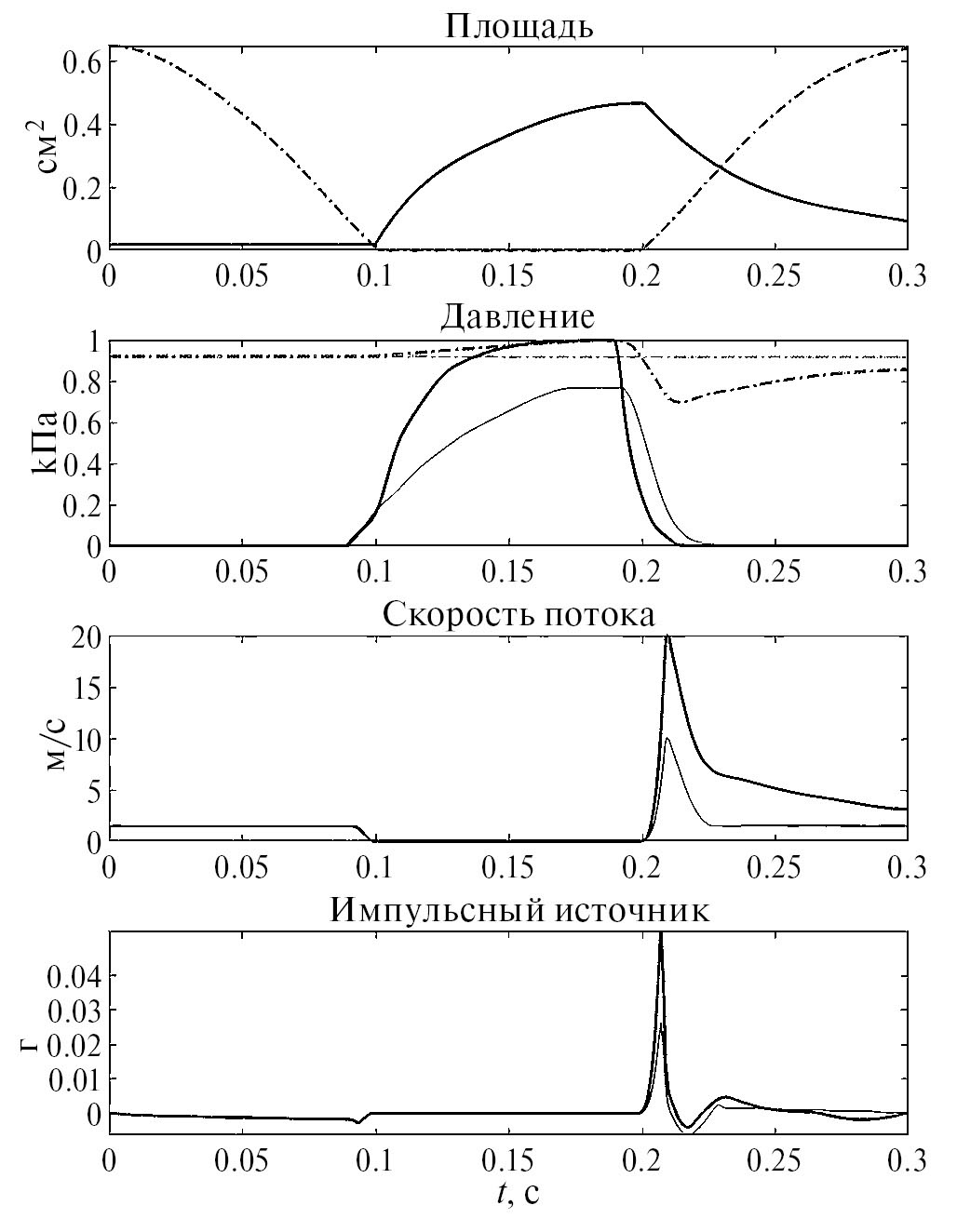 Рис. 1. Площадь Svt (—), Svs (—); давление Puvs на глухой (-∙-) и звонкой (-∙-) смычке; давление Pvt на глухой (—) и звонкой (—) смычке; скорость V на глухой (—) и звонкой (—) смычке; импульсный источник W на глухой (—) и звонкой (—) смычке