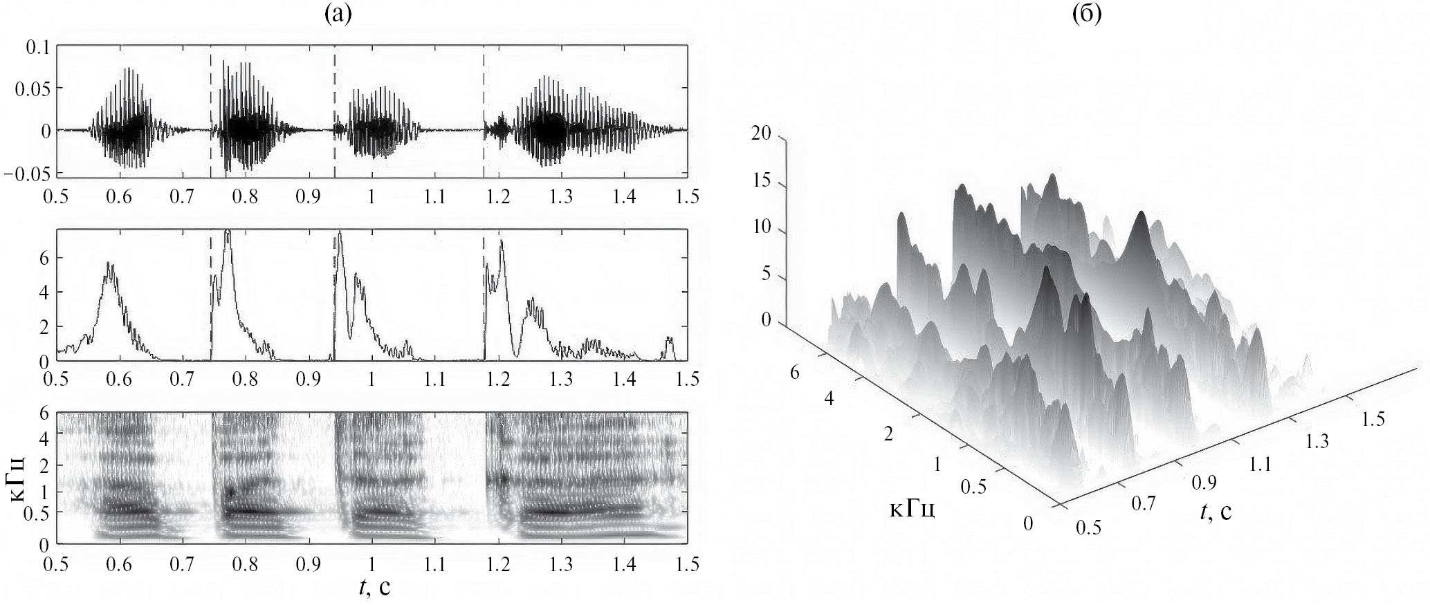 Рис. 2. Звукосочетание /апатакА/. (а) — Сверху вниз: речевой сигнал, суммарный отклик кратковременного динамического детектора, сонограмма речевого сигнала; начало речевого взрыва — пунктир. (б) — Трехмерная сонограмма кратковременного динамического детектора