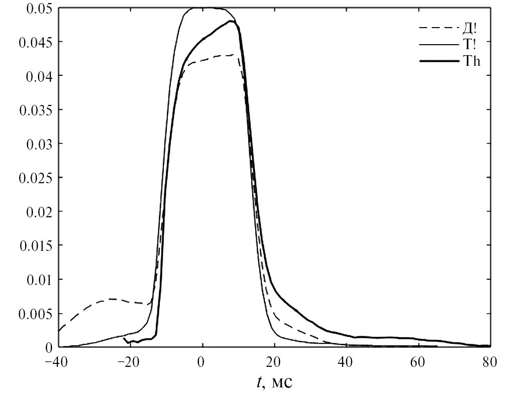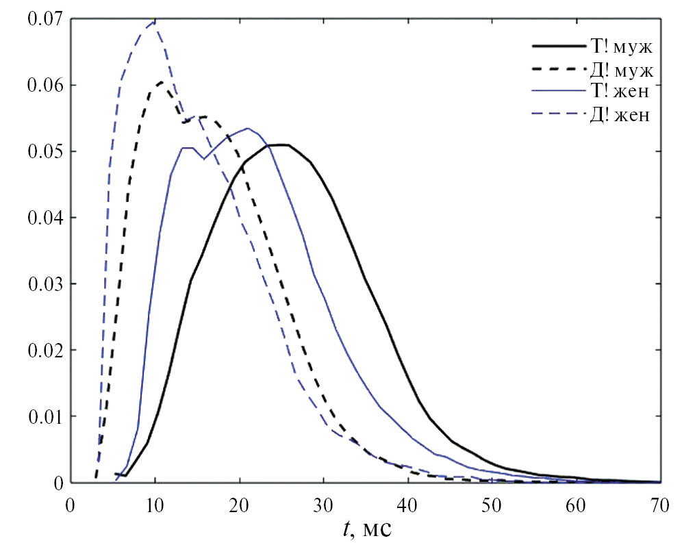 В табл. 2 наиболее вероятные значения распределений ΔTvot речевых взрывов Т! и Д! мужских голосов различаются примерно в полтора-два раза, но абсолютная разница составляет всего около 10 мс. У женских голосов ΔTvot практически не отличаются ни для строго импульсных, ни для аспиративных взрывов. Как видно на рис. 7, распределения для речевого взрывов заметно перекрываются, и гипотеза о присутствии голосового источника на предыдущем сегменте оправдывается лишь в том случае, когда ΔTvot импульсного источника меньше 17 мс для женских голосов и 25 мс для мужских голосов. Это накладывает жесткие ограничения на погрешность автоматического определения ΔTvot в задачах речевых технологий. Обнаружено также, что распределения ΔTvot аспиративных взрывов Тh и Дh практически полностью перекрываются, что не позволяет судить о типе предшествующей смычки.