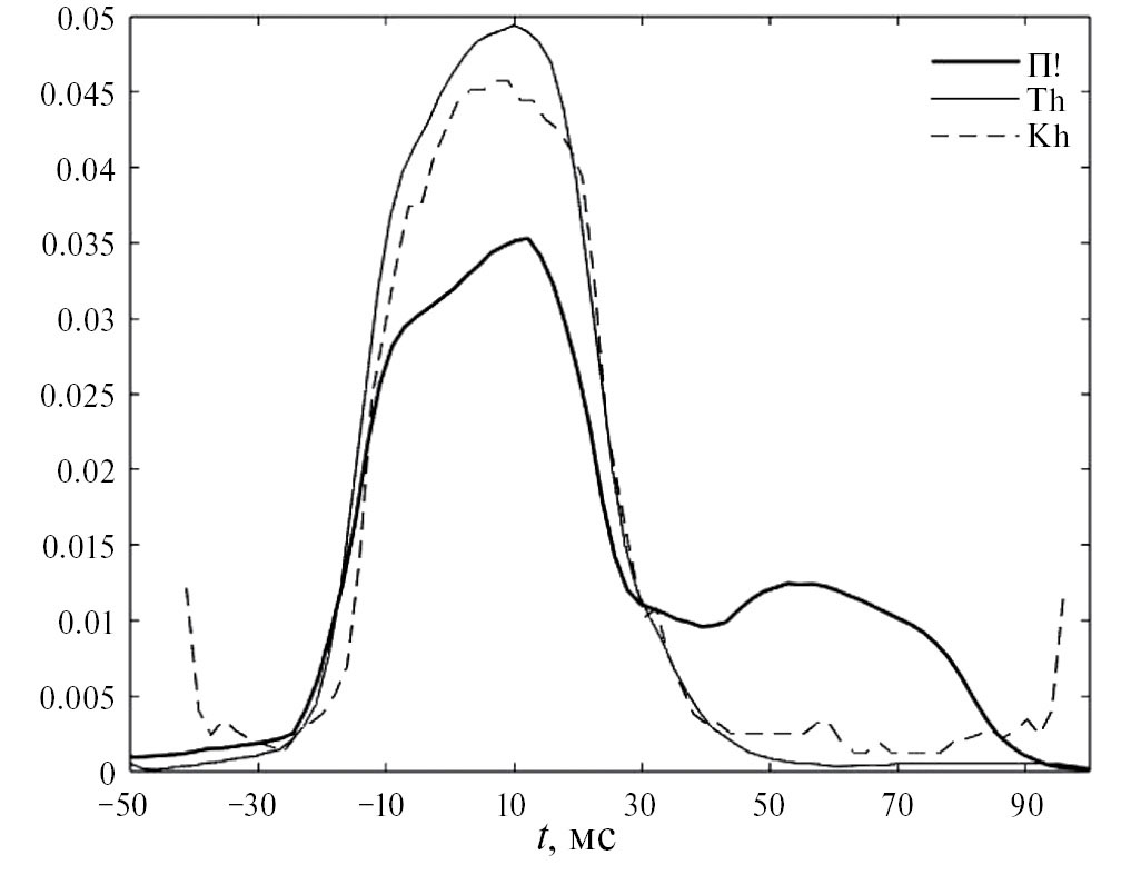 Рис. 5. Рассогласование между положением максимума сходства собственных функций П!, Тh, Kh и ручной разметкой начала речевого взрыва