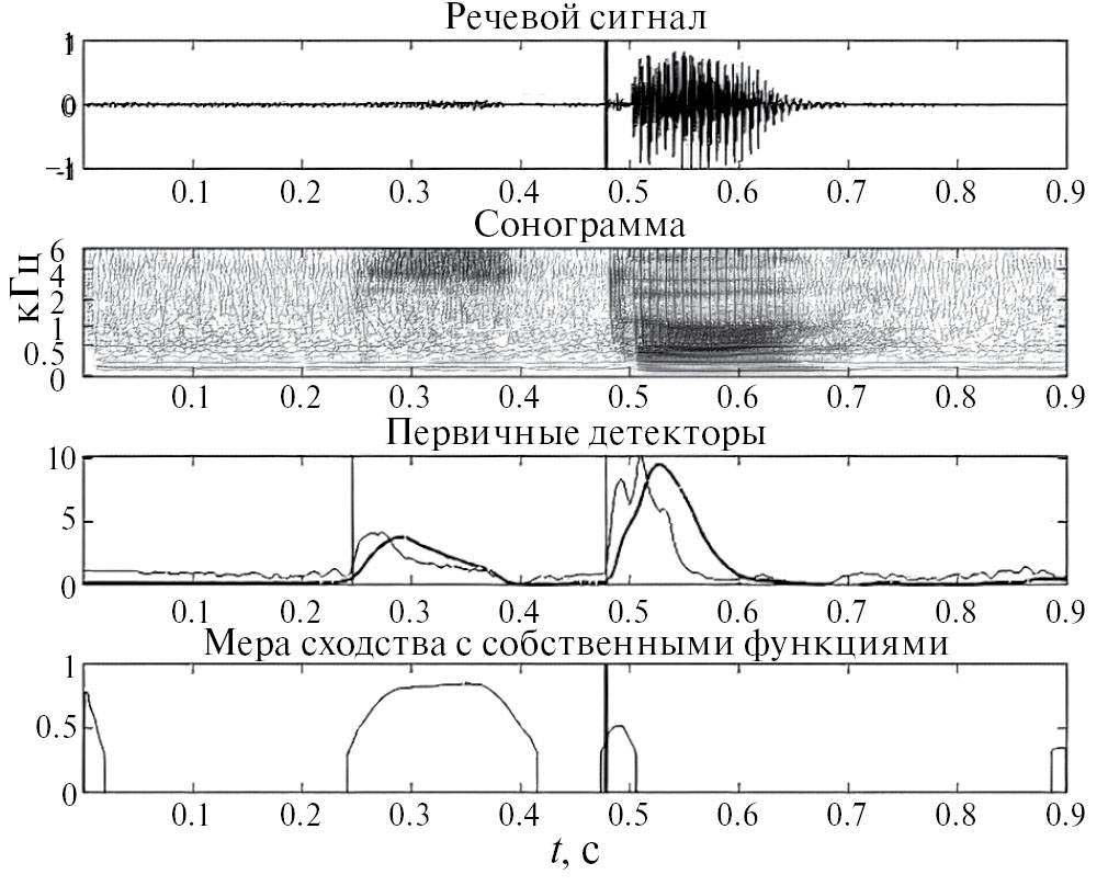 На рис. 6 представлены отклики кратковременного (—) и долговременного (—) первичного детектора амплитудных модуляций, а также коэффициент максимального сходства текущего спектра речевого сигнала и множества собственных функций аспиративного взрыва Тh в слове /сто/. Вертикальные линии отмечают возможное положение начала взрыва, найденного анализом первичных детекторов (—), и коэффициента максимального сходства (—). Согласованное решение о начале речевого взрыва показано на осциллограмме речевого сигнала.