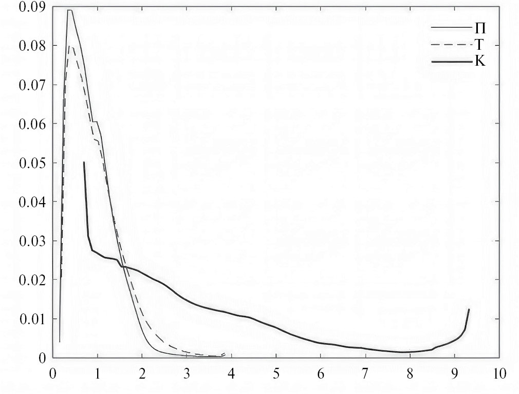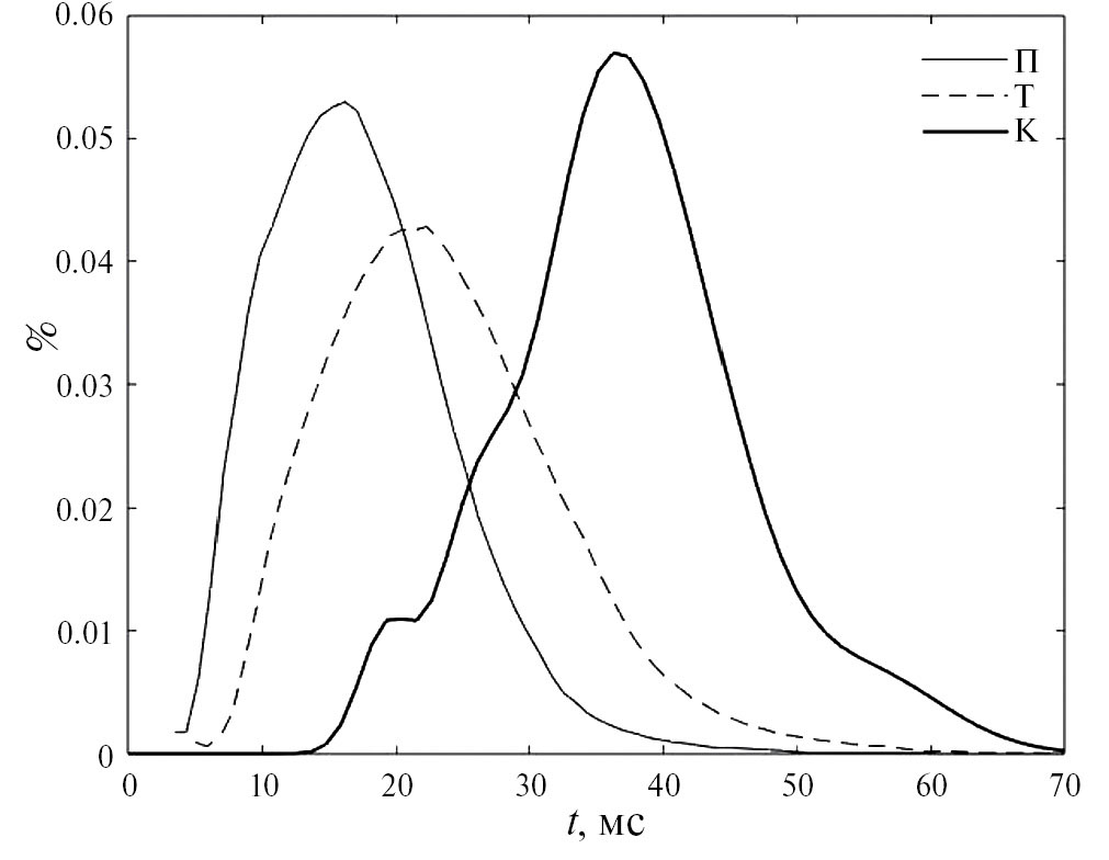 На значение ΔTvot влияют параметры артикуляторных органов и координация их движений. В этом отношении артикуляция согласных /к, г/ отличается от артикуляции губных и переднеязычных /п, б, т, д/. В первом случае вовлечены относительно большие массы с заметной инерционностью, тогда как движения губ и кончика языка более быстрые, и координация их движений требует меньшего времени. На рис. 8 видно, что распределения ΔTvot между /п, т/ различаются незначительно, а распределение для /к/ заметно отличается от распределения для /т/ и, особенно, для /п/. Это может послужить признаком места артикуляции согласного /к/. Для оценки возможности использования распределения ΔTvot согласных /б, г/ при детектировании голосового источника на предшествующей смычке нужны дополнительные эксперименты со звонкими взрывными согласными.