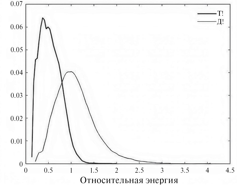 Рис. 9. Распределения относительной энергии импульсных взрывов Т! и Д! в амплитудном спектре; направленный микрофон