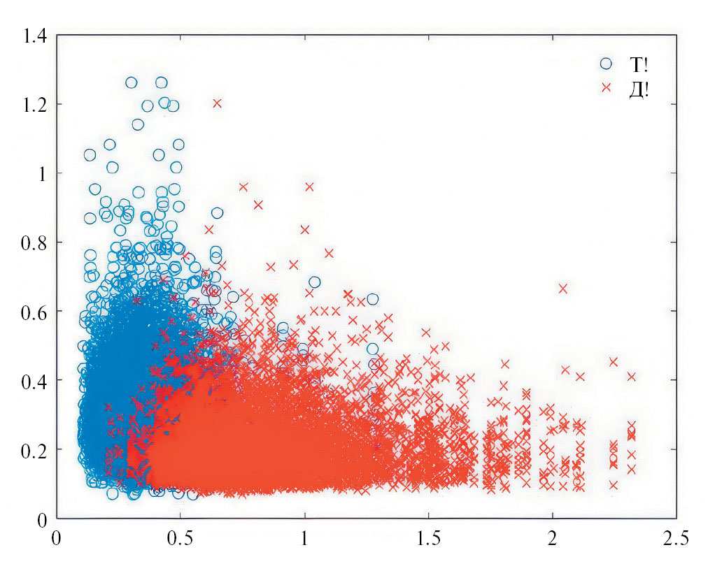 Параметры речевого взрыва глухой и звонкой смычки различаются в области низких и высоких частот как в амплитудном спектре, так и в спектре групповой задержки. Величина Ehl = Ehigh / Elow характеризует относительную энергию в области частот основного тона, связанную с присутствием голосового источника. Здесь Ehigh — средняя энергия в полосе частот 2500–6000 Гц, а Elow — средняя энергия в полосе 50–500 Гц на интервале времени [Tbmax, Tvow — 2 мс], где Tbmax — момент максимального значения импульсного источника, а Tvow — момент начала гласного. Распределения этого отношения для противопоставления звонкого Д! и глухого взрыва T! между согласными /т, д/ для мужчин и женщин по данным ручной разметки базы числительных русского языка представлены на рис. 9. Было также обнаружено, что распределение отношения энергии Ehl мало зависит от типа взрыва — сосредоточенного (T!, Д!) или с заметной долей фрикативного сегмента (Th, Дh).