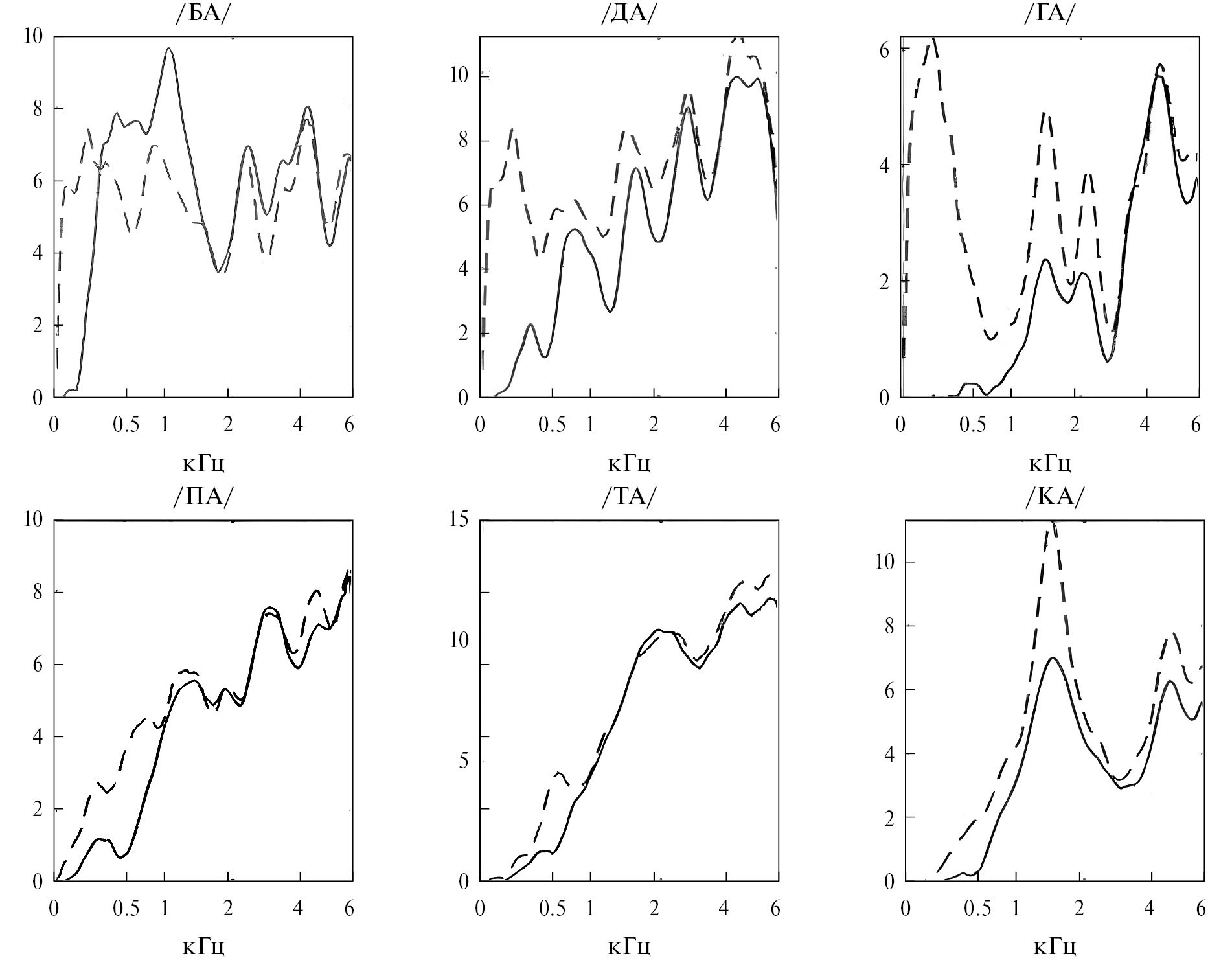 Рис. 11. Спектры звонких и глухих речевых взрывов: кратковременный динамический детектор (—); взрыв (---)