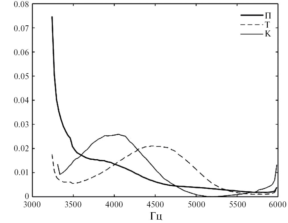 В исследованиях свойств речевых взрывов, порождаемых импульсным источником, исходят из представления о том, что в момент речевого взрыва его спектр наиболее точно отражает форму речевого тракта. В поисках инвариантов места артикуляции в [3–5] спектральные характеристики речевого взрыва изучались с использованием синтезированных и реальных звукосочетаний. В [6] было найдено, что амплитуда спектра взрыва в полосе частот выше 2500 Гц и в области частот второй и третьей форманты содержит информацию для определения места артикуляции. Отмечалось большое разнообразие спектральных характеристик речевого взрыва и их зависимость от последующего гласного.