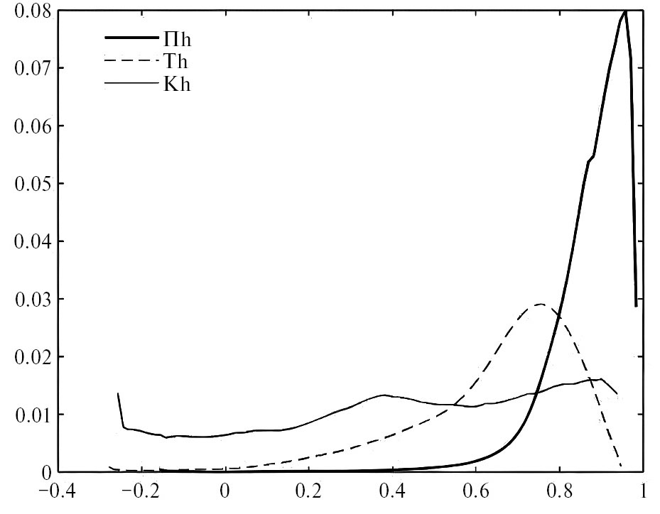 Рис. 15. Мера сходства собственных функций кратковременного детектора спектра речевого взрыва Кh (—) и спектров кратковременного детектора речевых взрывов Пh и Тh