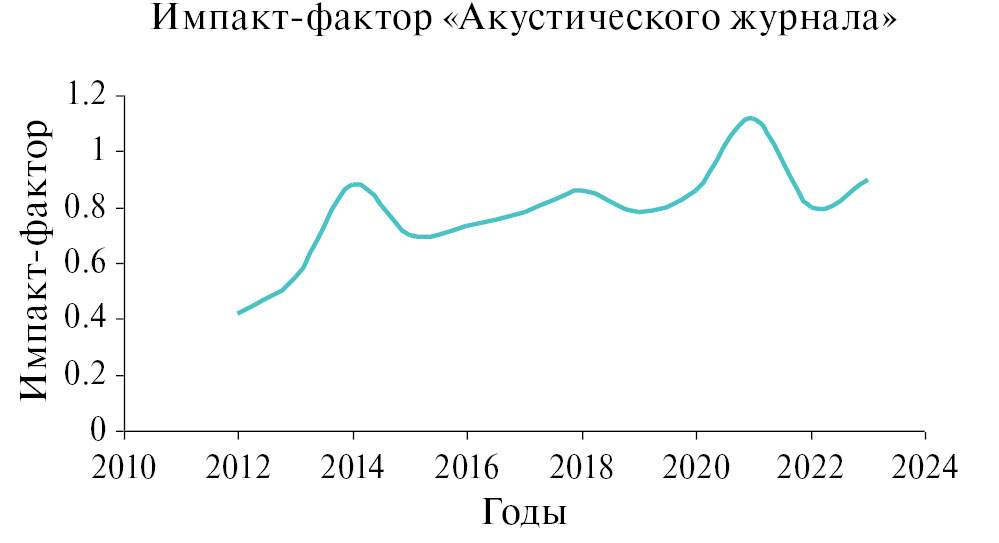 Сайт русскоязычного архива «Акустического журнала» http://akzh.ru был создан в 2012 г. [1] и в настоящее время хорошо знаком многим специалистам, активно работающим в области акустики. Ежедневно его посещают десятки пользователей, а количество открываемых страниц исчисляется несколькими сотнями [2]. Архив позволяет не только знакомиться с новыми выпусками журнала, но и обращаться к любой статье из его 70-летней истории. Именно это качество послужило увеличению импакт-фактора журнала более чем в 2 раза [3] (рис. 1).