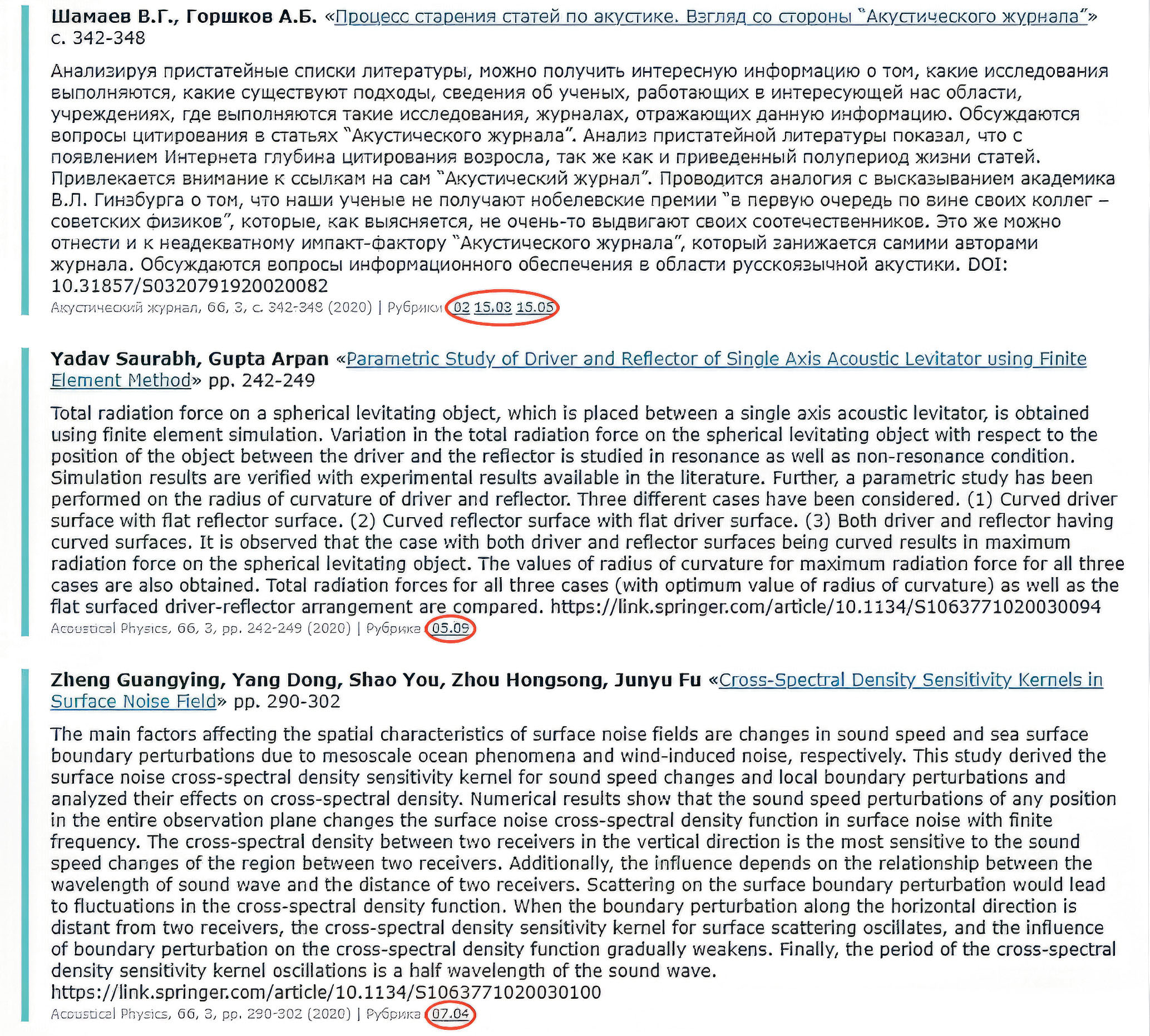 В течение долгого времени, а именно до 2009 г. статьи «Акустического журнала» просто переводились, и журнал в англоязычной версии выходил под названием сначала «Soviet Physics: Acoustics», а затем «Acoustical Physics». Но с № 1 2009 г. в английском варианте журнала начали появляться оригинальные статьи, отсутствовавшие в русскоязычном журнале, и наоборот — не все русскоязычные статьи стали переводиться. Чтобы как-то поддерживать полноту информации об изданиях журнала, мы стали помещать данные об англоязычных статьях на странице содержания соответствующего номера «Акустического журнала», после русскоязычных статей. Их было немного, да и не во всех номерах. Они нами не переводились, а приводились авторы, оригинальное название статьи, номера страниц англоязычного издания, англоязычное резюме и гиперссылка на статью (см. рис. 4). Статьям присваивались рубрики, так же как и статьям русскоязычного издания, с использованием рубрикатора «Акустического журнала».