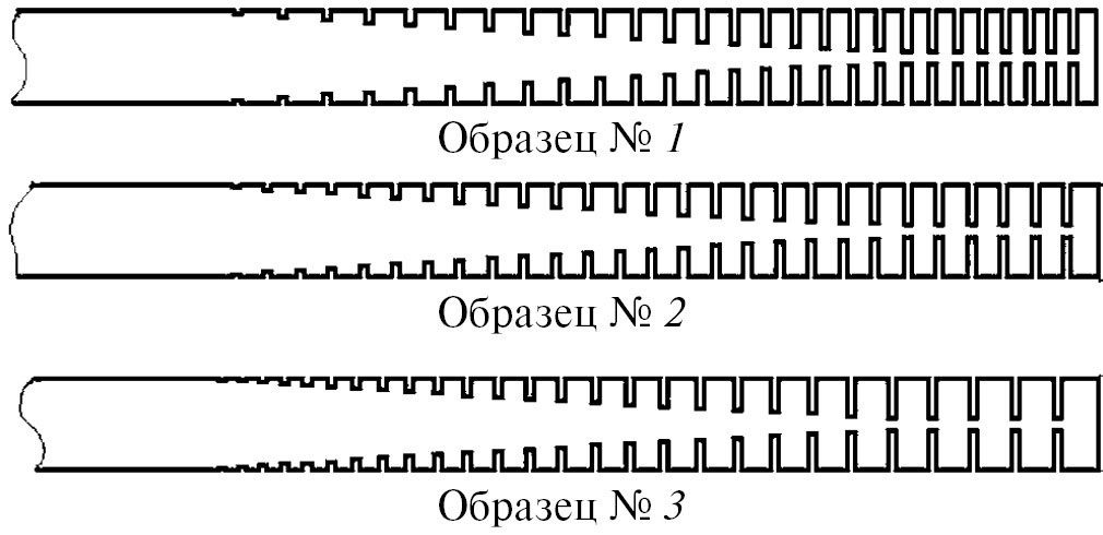 В качестве образцов были заданы стержни с размерами 3.9×6.8×200 мм. 28 прорезей расположены на участке стержней длиной 90 мм на разных расстояниях друг от друга в зависимости от образца. Рассматривались три типа закона распределения разрезов вдоль стержня (рис. 1): образец № 1 с учащением прорезей к концу стержня (вдоль оси X); образец № 2 с одинаковым расстоянием между прорезями; образец № 3 с разрежением прорезей к концу стержня.