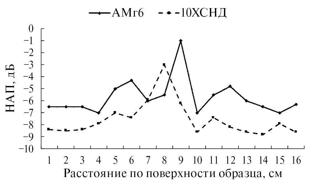Для мониторинга повреждения металла, связанного с появлением «зародышей» процесса разрушения, образцы алюминиевого сплава АМг6 и стали 10ХСНД были подвергнуты пластической деформации до образования на рабочей части образцов зоны гарантированного повреждения в виде шейки, которая образовалась на расстоянии 9 см от края образца АМг6 и 8 см образца стали 10ХСНД. Данные о значениях показателей нелинейности по длине образцов, полученные с помощью разработанного устройства, представлены на рис. 2.