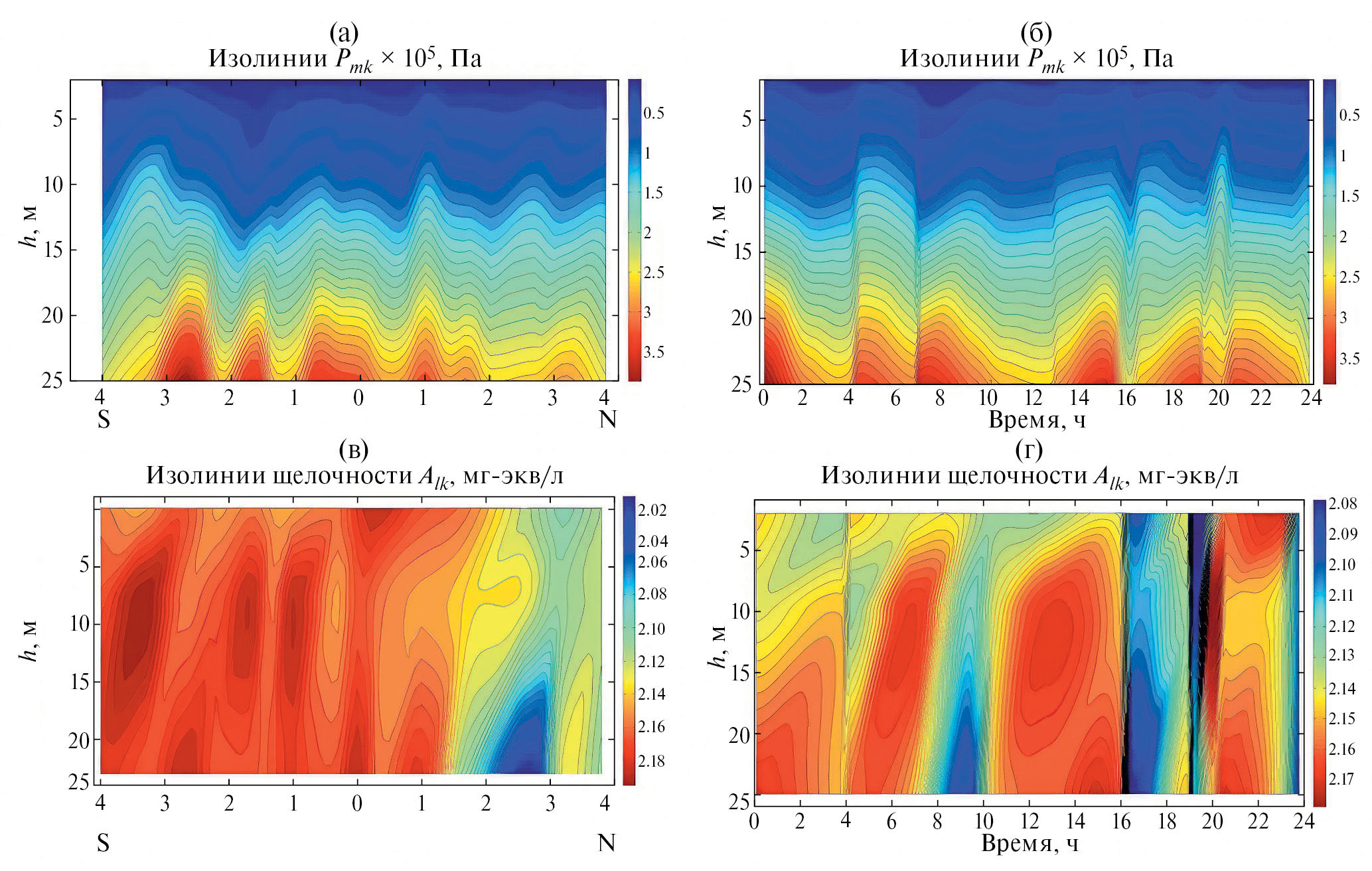 Рис. 1. (а), (в) — Пространственная изменчивость. Изолинии: (a) — КП, Pmk×105 Па; (в) — щелочность, Alk, мг-экв/л; по оси абсцисс отложена широта в градусах. По оси ординат отложена глубина в метрах. (б), (г) — Временная изменчивость. Изолинии: (б) — КП, Pmk×105 Па; (г) — щелочность, Alk, мг-экв/л; по оси абсцисс отложено время в часах. По оси ординат отложена глубина в метрах
