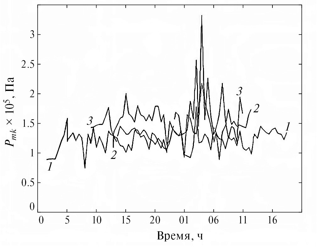Рис. 2. Зависимость величины КП, Pmk×105 Па от времени в часах. Кривая 1 — станция № 1181; Кривая 2 — станция № 1183; Кривая 3 — станция № 1184. Глубина 10 м