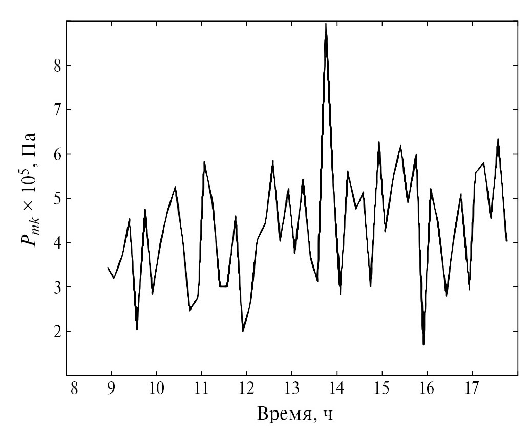 Рис. 3. Зависимость величины КП, Pmk×105 Па от времени в часах. Станция № 1185. Глубина 25 м