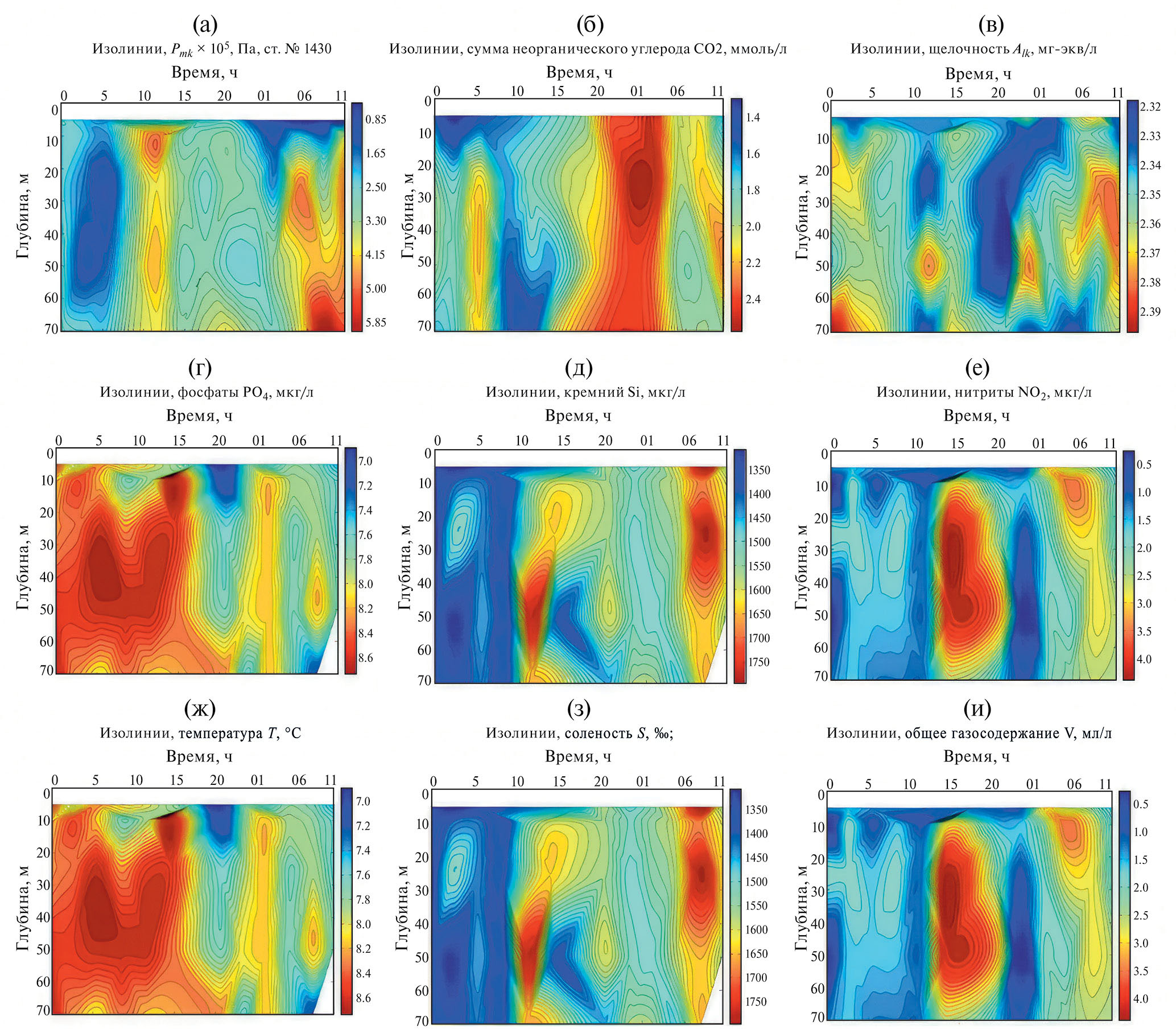 Рис. 4. Временная изменчивость. Станция № 1430. (a) — изолинии Pmk×105 Па; (б) — изолинии ΣСО2, ммоль/л; (в) — изолинии щелочности Alk, мг-экв/л; (г) — изолинии фосфаты PO4, мкг/л; (д) — изолинии концентрации кремния Si, мкг/л, (е) — изолинии концентрации нитритов NO2, мкг/л; (ж) — изолинии температуры Т, °С; (з) — изолинии солености S, ‰; (и) — изолинии общего газосодержания V, мл/л. По оси абсцисс отложено время в часах. По оси ординат отложена глубина в м