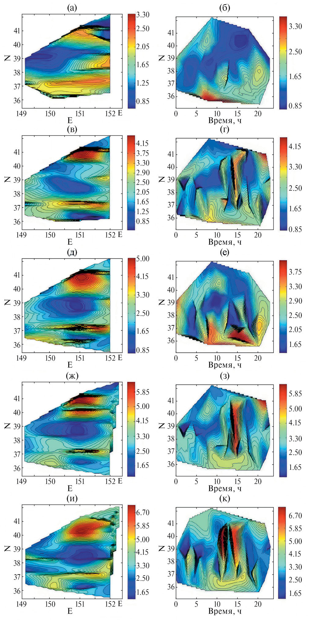 Рис. 6. (а), (в), (д), (ж), (и) — Пространственная изменчивость, изолинии Pmk×105 Па. (б), (г), (е), (з), (к) — Временная изменчивость, изолинии Pmk×105 Па. (а), (б) — Глубина 5 м; (в), (г) — глубина 10 м; (д), (е) — глубина 25 м; (ж), (з) — глубина 50 м; (и), (к) — глубина 70 м. По оси абсцисс отложено время в часах
