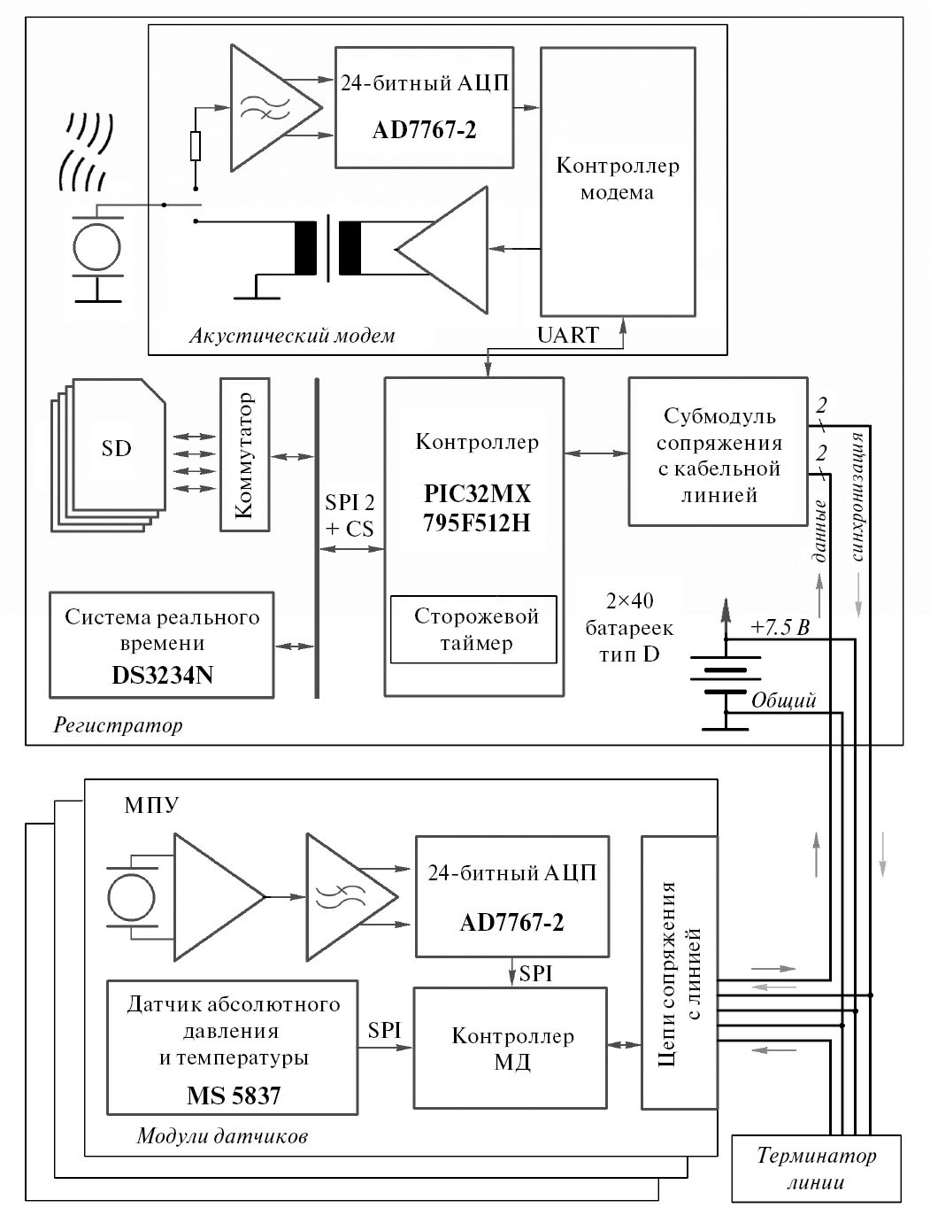 Вертикальные акустико-гидрофизические системы являются полезным инструментом решения как чисто научных задач, таких как исследования влияния пространственно-временных неоднородностей на распространение звука на шельфе и исследования модовых структур низкочастотных звуковых полей и внутренних волн [1], так и более прикладных, например, в качестве приемника системы звукоподводной связи [2]. Общим для всех этих задач является необходимость долговременного и непрерывного измерения вариаций акустического давления синхронно с гидрологическими параметрами на нескольких горизонтах, что предполагает достаточно традиционный набор первичных преобразователей (ПП) − датчиков температуры, гидрофонов, иногда приемников колебательной скорости или ускорения.