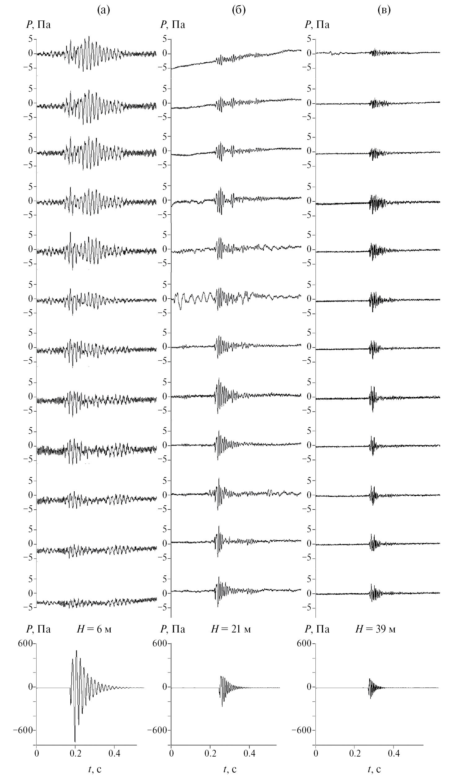 Рис. 6. Вариации акустического давления в импульсах, излученных пневмопушкой на глубине (а) − 6 м, (б) − 21 м и (в) − 39 м. Вариации акустического давления, измеренные опорным гидрофоном на расстоянии 1.5 м от излучателя − (нижний ряд) и на 12 горизонтах на расстоянии 500 м системой «Моллюск-21» − (верхние ряды). Гидрофоны приемной системы находились на глубинах 3.73, 6.7, 9.67, 12.67, 15.82, 18,77, 21.73, 24.75, 27.92, 30.89, 33.86, 36.7 м