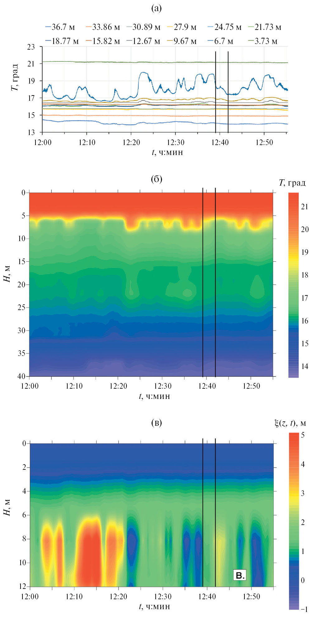 Рис. 7. (а) − измеренные вариации температуры воды на 12 горизонтах, (б) − рассчитанные по этим измерениям вариации температуры воды по глубине, (в) − вертикальные смещения воды в приповерхностном 12-метровом слое