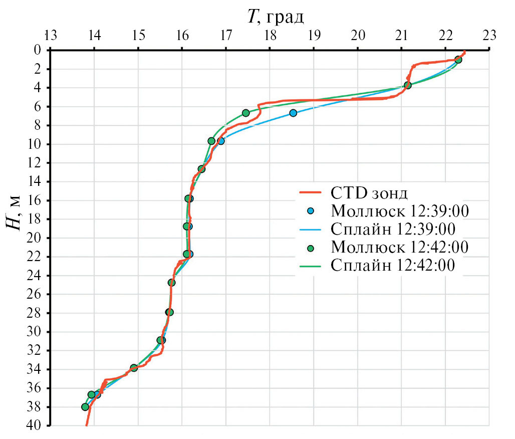 Модули датчиков систем «Моллюск» располагаются на расстоянии 3 м друг от друга, что достаточно, например, для расчета модового состава низкочастотного акустического поля, регистрируемого системой. Однако при измерении вертикального профиля температуры воды такой большой шаг может приводить к некоторым погрешностям. На рис. 8 приведен профиль, записанный зондом AML Oceanographic MINOS-X в интервале времени 12:39−12:42, (на рис. 7 этот интервал отмечен вертикальными черными линиями), а также показания температурных датчиков системы «Моллюск-21» в моменты начала и конца указанного временного промежутка и построенные по ним сплайны. Как можно видеть, во время эксперимента стратификация слоев морской воды была выражена очень резко, и количества горизонтов, на которых имелись термодатчики системы «Моллюск», недостаточно для точных измерений температурного профиля в зоне скачка температуры. Построенные сплайны дают приближенное, сглаженное представление о реальном распределении температуры морской воды. Тем не менее, рис. 7б позволяет получить качественное представление о процессах на шельфе. Следует заметить, что и профиль, записанный зондом, имеет существенную погрешность, порожденную уже не дискретностью измерений по вертикали, а значительным временем подъема зонда. Как можно видеть на рис. 7а, в указанный промежуток времени через точку зондирования проходила внутренняя волна (ВВ), профиль температуры непрерывно изменялся и полученный зондом профиль невозможно отнести к какому-то конкретному моменту времени.