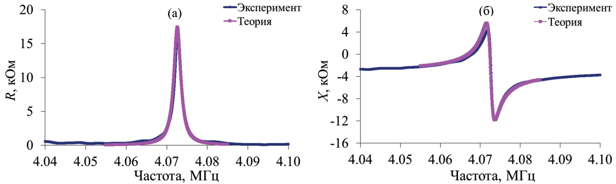 Результат подгонки расcчитанных и измеренных частотных зависимостей реальной и мнимой частей электрического импеданса свободного резонатора представлен на рис. 2. Видно хорошее их соответствие.