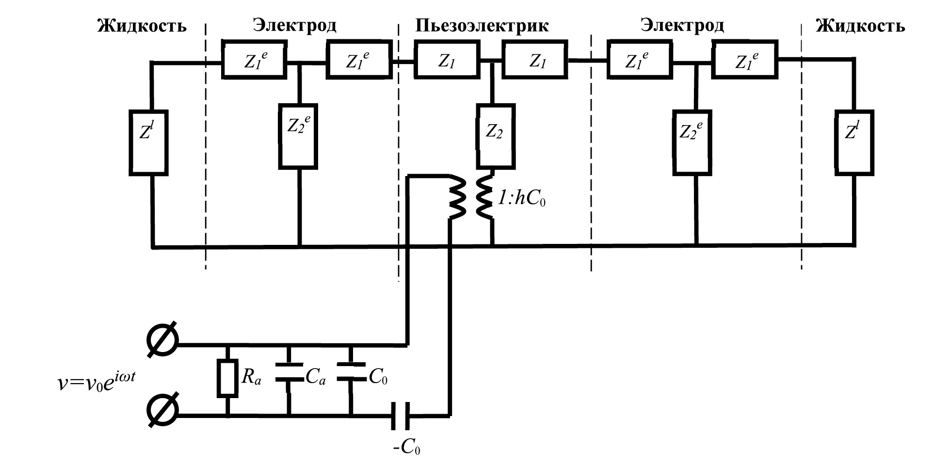 Затем контейнер заполняли образцом исследуемой жидкости так, чтобы резонатор был полностью погружен в жидкость, и повторяли измерение указанных частотных зависимостей. Ниже представлена схема Мэзона для описанного резонатора из лангасита, контактирующего с исследуемой жидкостью, и описана методика определения материальных постоянных этой жидкости.