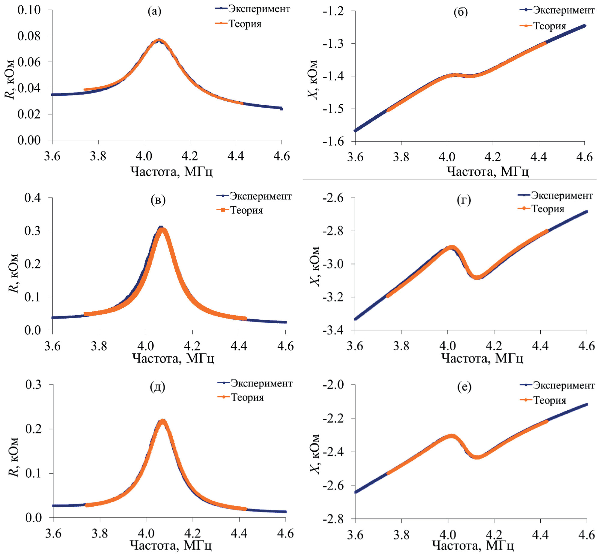 Таким образом, в данной работе на основе эквивалентной схемы (рис. 4) погруженного в жидкость резонатора с продольным электрическим полем определялись модуль упругости C11l, коэффициент вязкости η11l непроводящих жидкостей, а также добавочная емкость Ca, добавочное сопротивление Ra и эффективная емкость резонатора C0 + C01. Определялся такой набор искомых величин C11l, η11l, Ca, Ra и C01, для которого экспериментальные частотные зависимости реальной и мнимой частей электрического импеданса погруженного в жидкость резонатора максимально соответствовали рассчитанным. В качестве непроводящих жидкостей исследовались дистиллированная вода, этиловый спирт, изопропиловый спирт, ацетон, жидкий парафин, керосин и уайт-спирит. Рис. 5 показывает, что расчетные частотные зависимости, полученные методом подгонки параметров в рамках используемой теоретической модели для реальной (R) и мнимой (X) частей электрического импеданса резонатора, погруженного в дистиллированную воду (рис. 5а, 5б), в керосин марки ТС-1 (рис. 5в, 5г) и в ацетон (рис. 5д, 5е) находятся в хорошем соответствии с экспериментальными данными. Проводимость этих жидкостей не превышала 2 мкСм/см.