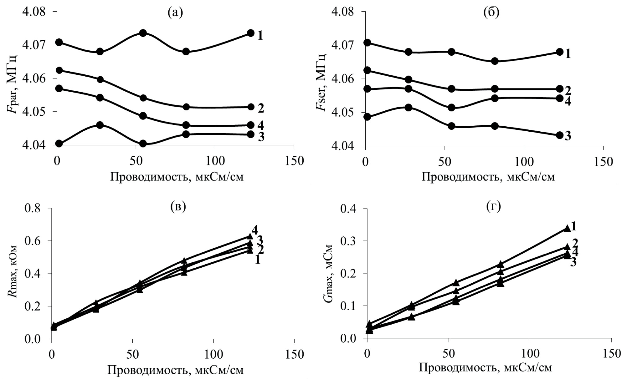 Рис. 6. Зависимости резонансной частоты (а) – параллельного и (б) – последовательного резонансов, (в) – максимальных значений реальной части электрического импеданса и (г) – адмиттанса резонатора из лангасита, погруженного в жидкость, от проводимости жидкости (1 – вода, 2 – смесь вода-глицерин β=44%, 3 – смесь вода-глицерин β=65%, 4 – смесь вода–глицерин β=75%).