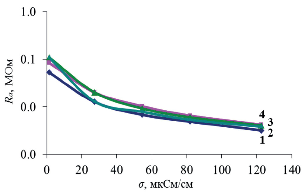 Рис. 10. Зависимости добавочного сопротивления Ra от проводимости жидкостей: 1 – вода, 2 – смесь вода-глицерин β=44%, 3 – смесь вода-глицерин β=65%, 4 – смесь вода-глицерин β=75%.