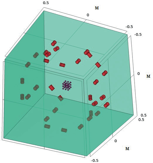 В лабораторном эксперименте, проведенном для тестирования обсуждаемого метода, измерения проводились в бассейне, представляющем собой заполненный водой куб со стороной 1 м. Точки , в которые поочередно помещался ЭМ, играющий роль ЭИ, образовывали куб размером см, показанный в центре рис. 1. Были проведены две серии измерений с кубами, в которых расстояния между соседними точками (шаг кубической решетки) составляли 2 и 3 см. Таким образом, в каждой серии были измерены поля ЭИ.