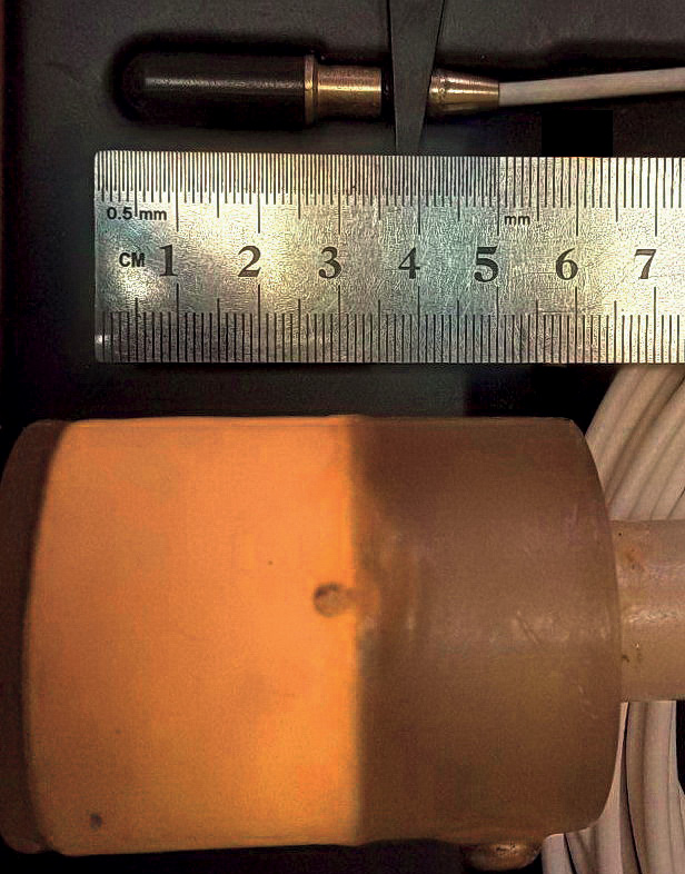В качестве ЭМ использовался миниатюрный эталонный обратимый гидрофон B&K 8103. В режиме излучения он не имеет резонансов и других особенностей в амплитудно-частотной характеристике в используемом в работе диапазоне частот. Для позиционирования ЭМ использовалась автоматизированная система, обеспечивающая точность перемещения по каждой из трех координат не хуже 0.1 мм. В качестве КИ использовался излучатель простейшей конструкции на основе кольца из пьезокерамики. Размеры кольца: внешний диаметр 50 мм, внутренний диаметр 46 мм, высота 30 мм. Для герметизации пьезокерамический элемент был покрыт воском. Рассматриваемый излучатель существенно меньше характерных длин волн, излучаемых в эксперименте, поэтому имеет характеристику направленности монопольного типа, что было проверено с помощью моделирования методом конечных элементов. Оба источника звука показаны на рис. 2.