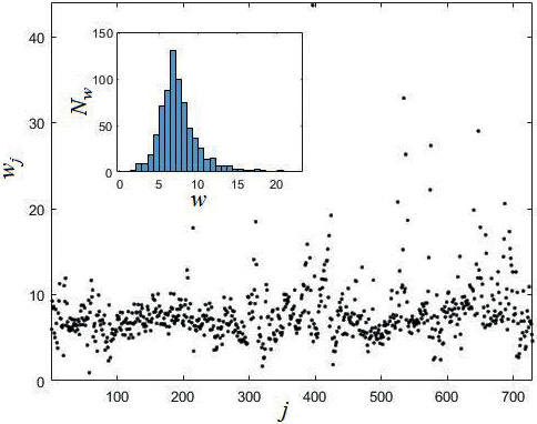 Если бы калибруемый и эталонный источники были идеальными монополями, на каждой частоте отношения для всех принимали бы одно и то же значение, совпадающее с отношением амплитуд данных источников в свободном пространстве (9). В действительности это не так. На рис. 3 приведены значения , полученные на частоте = 7000 Гц для куба с шагом 2 см и (в верхнем левом углу) гистограмма распределения этих значений. Похожие распределения наблюдаются на всех частотах для обоих кубов. В качестве оценок отношения амплитуд сравниваемых источников на каждой частоте мы принимаем и среднее и медианное значения измеренных величин . В качестве еще одной оценки принимаем