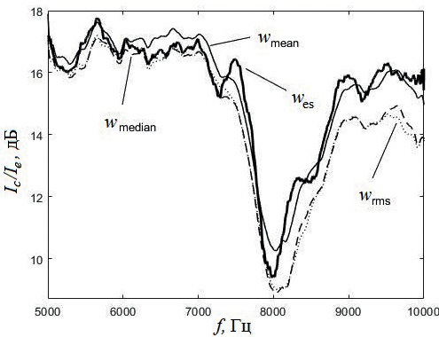 Обсуждаемый метод позволяет реконструировать диаграмму направленности КИ в свободном пространстве, а также оценивать амплитуды сферических гармоник возбужденного им поля [8]. Однако в данной работе для демонстрации работоспособности метода мы ограничиваемся реконструкцией частотной зависимости интенсивности источника, который приближенно можно считать монопольным. Дело в том, что при работе с таким источником найденную оценку отношений КИ и ЭМ мы можем сопоставить с альтернативными оценками того же отношения , и , полученными на основе тех же измерений. На рис. 4 мы видим, что все четыре оценки, как и должно быть, дают близкие результаты. Разброс их значений на каждой из рассмотренных частот не превышает 2.5 дБ. Практическое применение обсуждаемого подхода для реконструкции диаграммы направленности более сложного мультипольного КИ и разложения его поля по сферическим гармоникам мы планируем рассмотреть в последующих работах.