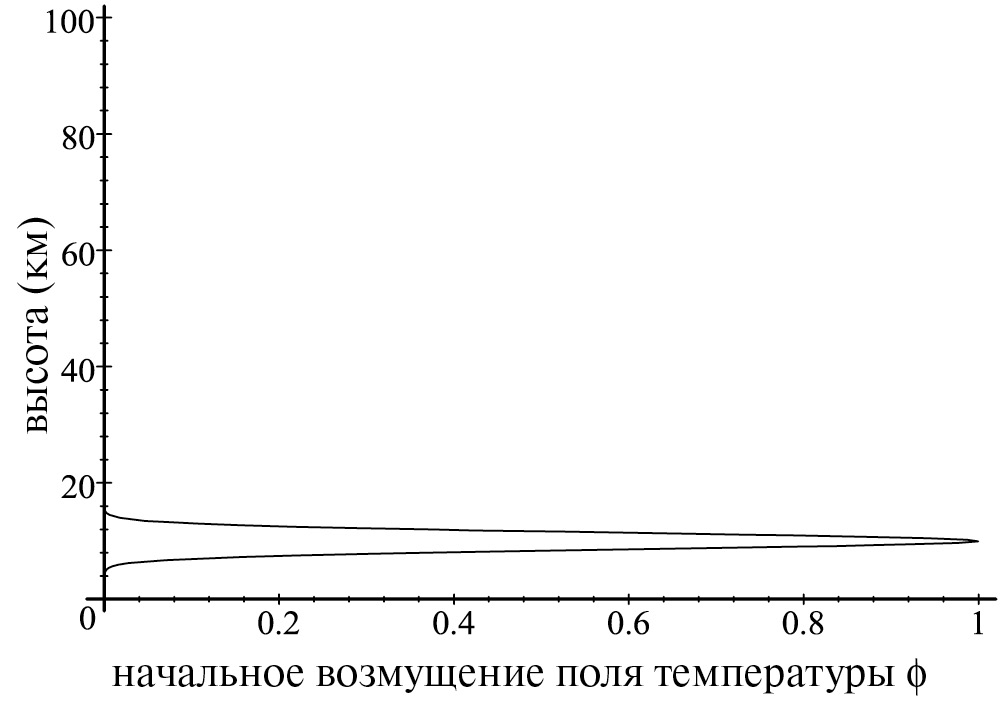 Предположим, задано начальное температурное возмущение (38). На Рис. 1 для примера изображена зависимость начального возмущения поля температуры от высоты для случая, когда тепловой источник задан гауссовой функцией с максимумом на высоте 10 км, и имеет полуширину 4 км.