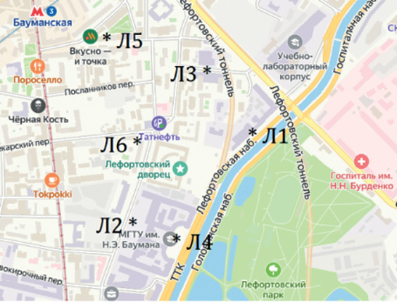Рис. 3. Расположение локаций. Локации Л1-Л4 находились около входов в учебные и жилые корпуса МГТУ, а Л5 и Л6 – на близкорасположенных территориях общего пользования.
