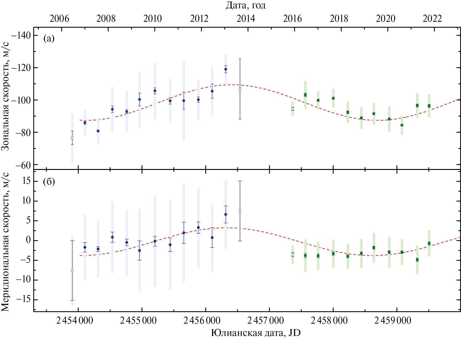 Рис. 2. Долговременные вариации средней (а) зональной и (б) меридиональной скоростей ветра, полученные по изображениям VMC (синий) и UVI (зеленый) на широте 10° ± 5° ю. ш. Каждая точка является результатом усреднения по венерианскому году. Вертикальными отрезками обозначен доверительный интервал 99.6% (3). Светло-голубая и светло-зеленая области соответствуют стандартному отклонению σ. Аппроксимирующие синусоиды отмечены красной пунктирной линией.
