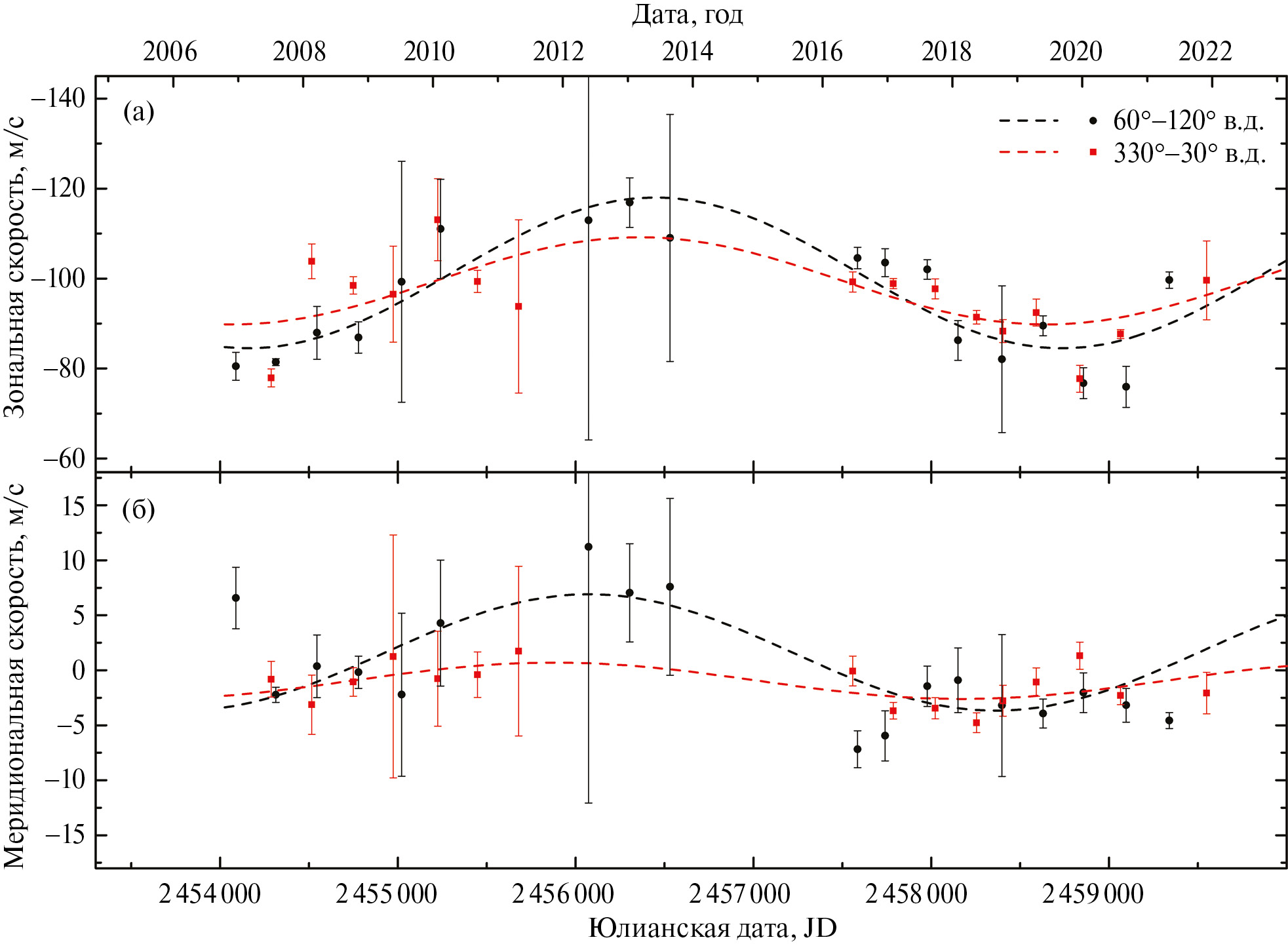 На рис. 2 представлены долговременные вариации средней зональной и меридиональной скоростей с 2006 по 2022 гг. в широтной полосе 10° ± 5° ю. ш. в околополуденное время 12 ± 1 ч и с ограничением по фазовому углу 60°–90°, полученные автоматизированным методом по наблюдениям с VMC на Venus Express и с UVI на Akatsuki. Для зональной компоненты знак “–” указывает на направление потока с востока на запад (ретроградная суперротация), для меридиональной компоненты “+” – смещение к северу, “–” – смещение к югу вдоль меридиана. Каждая точка на графике является результатом усреднения по венерианскому году (224.7 суток) в рассматриваемой широтной полосе. При указанных ограничениях первый и последний годы наблюдений с VMC представлены сравнительно малым количеством результатов. Первый год наблюдений с UVI является результатом усреднения только за двое земных суток. Анализ на периодичность, аналогичный представленному в (Khatuntsev и др., 2022), также обнаружил период 12.5 ± 0.5 года. На рис. 2 показаны аппроксимирующие синусоиды средней зональной и средней меридиональной компонент скорости ветра. Зональная компонента имеет амплитуду 10.6 ± 1.0 м/с относительно среднего –98.9 ± 0.7 м/с, при этом амплитуда меридиональной компоненты составляет 3.4 ± 0.4 м/с относительно среднего –0.8 ± 0.3 м/с. Некоторые возможные причины существования долговременной квазипериодичности, такие как периодические изменения в состоянии атмосферы и периодические изменения солнечной активности, были рассмотрены нами в (Khatuntsev и др., 2022).