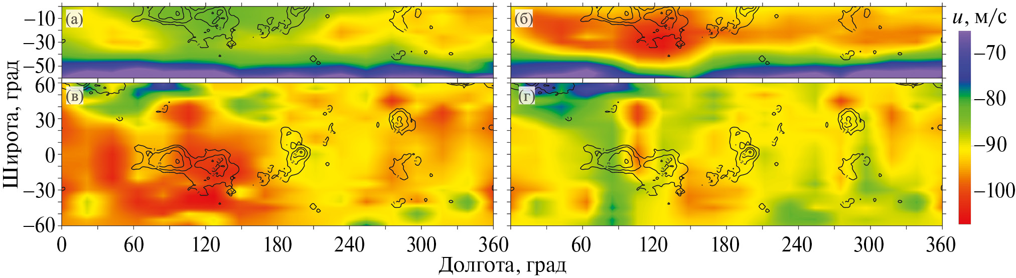 Рис. 5. Пространственное распределение средней зональной скорости ветра, усредненное за временные промежутки 2007–2010 (а), 2010–2013 (б), 2016–2019 (в), 2017–2020 (г). Черными контурами отмечены возвышенности поверхности планеты более 1 км.