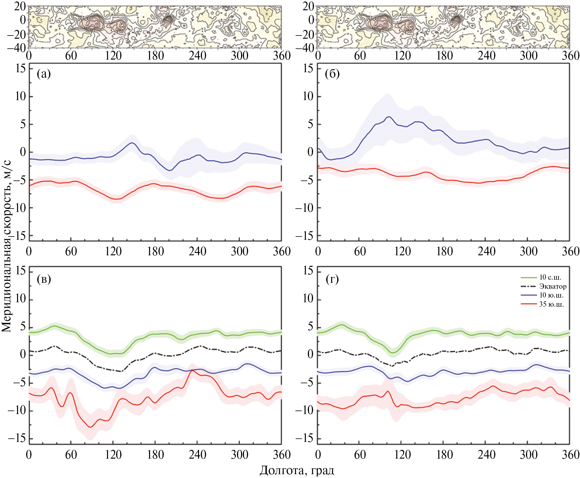 Влияние рельефа на динамику атмосферы предполагает не только изменение величины зональной скорости, но и изменение меридиональной, согласующееся с рельефом подстилающей поверхности. Долготная зависимость меридиональной скорости для 10° и 25° ю. ш., усредненная по всему объему данных, полученных с VMC, показала наличие вариаций, связанных с Землей Афродиты (Patsaeva и др., 2019). На рис. 6 показаны долготные вариации меридиональной скорости для разных широт экваториальной области Венеры, полученные по данным с VMC (рис. 6а, 6б) и UVI (рис. 6в, 6г) для венерианских шестилетних интервалов наблюдений, близких к максимуму и минимуму долгопериодической зависимости средней зональной скорости. Временные интервалы соответствуют тем, которые были взяты для исследования зональной скорости. Каждая кривая являются результатом усреднения данных в десятиградусной широтной полосе и показывает изменение меридиональной скорости на 10° и 35° ю. ш. для VMC. Для UVI дополнительно представлены вариации меридиональной скорости на экваторе и на 10° с. ш. Изменяющийся рельеф горного массива Земля Афродиты вместе с предгорьями простирается от 50° до 210° в. д. и от 40° ю. ш. до 20° с. ш. (см. рис. 5, черные контуры). Наиболее высокая часть горного массива (области Овды и Тефии) расположена от 60° до 140° в. д. и от 20° ю. ш. до 5° с. ш. В соответствии с характером динамики атмосферы Венеры, усредненный горизонтальный поток на уровне верхнего облачного слоя в дневные часы направлен от экватора к полюсу в каждом полушарии. Влияние, которое оказывает Земля Афродиты на меридиональную скорость, выражается в изменении направления горизонтального потока к северу или к югу в соответствии с особенностями рельефа в зависимости от широты. Для VMC (рис. 6а, 6б) и UVI вблизи максимума долгопериодической зависимости (рис. 6в) существенная разница в поведении кривых на долготах Земли Афродиты наблюдается в южном полушарии Венеры (10° и 35° ю. ш., синяя и красная кривые). Для UVI вблизи минимума долгопериодической зависимости (рис. 6г) наибольшая разница фиксируется между поведением меридиональной скорости на широтах севернее и южнее наибольших высот Земли Афродиты (10° с. ш. и 35° ю. ш., зеленая и красная кривые). Хотя долготная привязка наибольшего отличия между кривыми несколько смещается от графика к графику, зависимость направления горизонтального потока от рельефа подстилающей поверхности наблюдается во всех рассматриваемых случаях.