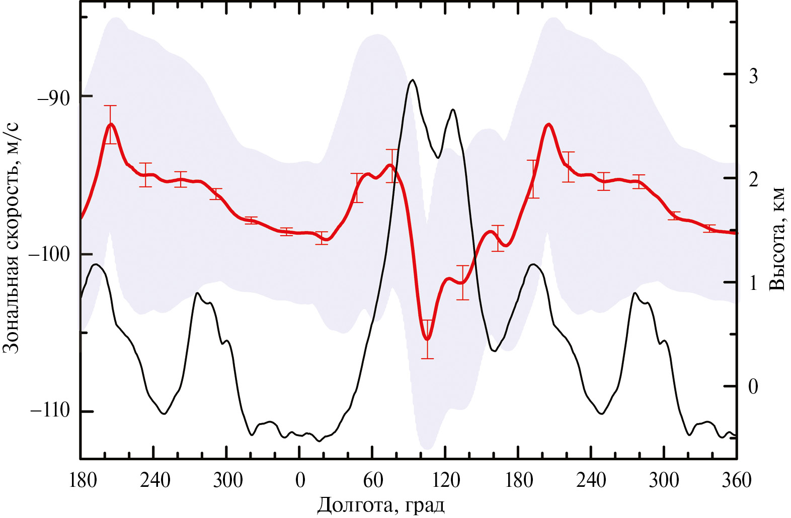 Рис. 7. Долготные вариации средней зональной скорости ветра в широтной полосе 10° ± 5° ю. ш. около полудня 12 ± 1 ч. с декабря 2015 г. по март 2017 г. (красный). Ошибка соответствует 99.6% доверительному интервалу (3). Светло-голубая область соответствует стандартному отклонению σ. Средняя высота рельефа поверхности в той же широтной полосе показана черной кривой.