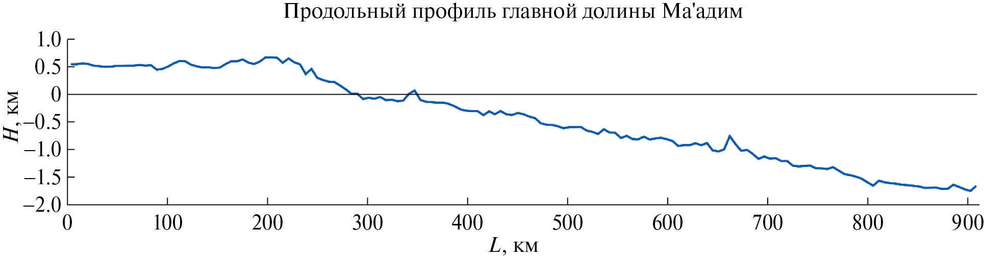 Для главного русла Ма’адим, можно выявить общий тренд – это пологонаклонная долина с вогнуто-выпуклым профилем длиной в 913.5 км. Она берет свое начало на возвышенной равнине на высоте ≈500 м, достигая в устьевой части отметки ≈–1600 м. Амплитуда высот составляет чуть более 2 км, следовательно, средний уклон значительно меньше одного градуса (~0.12°). Длинноволновая компонента продольного профиля долины имеет незначительные перегибы. Для характеристики локальной топографической конфигурации долины Ма’адим была построена серия поперечных профилей с шагом ~200 км (рис. 4).
