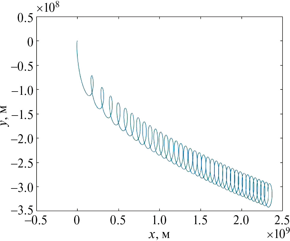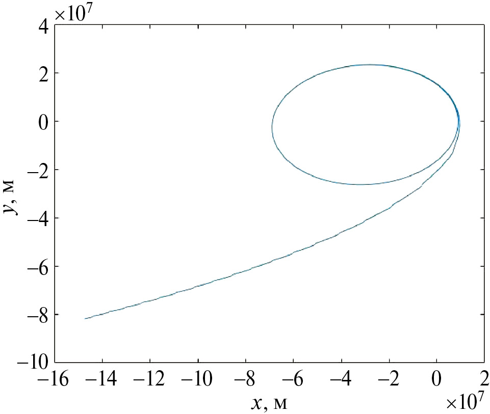 В рамках плоской ограниченной задачи трех тел рассмотрим случай параболо-эллиптического движения. Пусть два массивных тела с массами m1 и m2 сближаются по параболическим траекториям, третье тело пренебрежимо малой массы m3 движется по эллиптической орбите относительно тела 2, его траектория в абсолютном пространстве до перехвата показана на рис. 1, финальное движение тела 3 после перехвата показано на рис. 2. В работе (Salnikova и др., 2023) показано, что имеется достаточно много начальных условий в системе, когда перехват наблюдается. Например, численное моделирование движения 500 не взаимодействующих между собой одинаковых частиц, первоначально равномерно распределенных по круговой орбите относительно тела 2, показало, что около 40% из них после момента наибольшего сближения по параболическим траекториям массивных тел переходят на эллиптические орбиты в окрестности тела 1. Из оставшихся частиц некоторые продолжают двигаться в окрестности тела 2, а остальные улетают на бесконечное расстояние от каждого массивного тела. Для гиперболических траекторий двух главных тел перехват имеет место, однако процент перехвата существенно уменьшается с ростом величины гиперболической скорости, а для скоростей, превышающих величину параболической скорости более чем в полтора раза, перехват не происходит совсем. При переходе к неограниченной постановке при условии достаточной малости третьей массы эффект перехвата сохраняется.