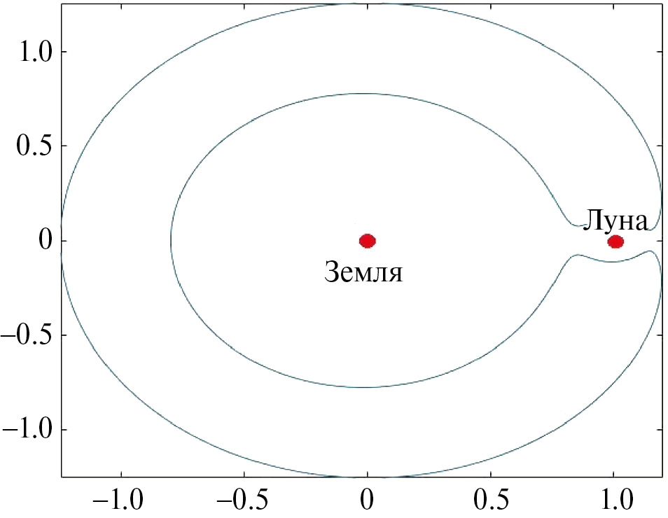 Теперь рассмотрим возможность вылета искусственного космического мусора, находящегося на круговых или эллиптических орбитах относительно Земли, принимая во внимание возмущение Луны, масса которой в 81 раз меньше массы Земли. Финальная гиперболо-эллиптичность будет заключаться в том, что частицы мусора получат относительную гиперболическую скорость. Для этого области Хилла возможного движения частицы должны быть не замкнуты (рис. 3).