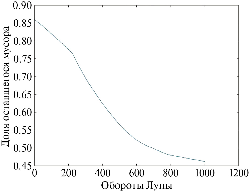 Возможный способ устранения околоземного мусора – это вывод мусора на достаточно высокие орбиты. Под влиянием Луны мусор с большой вероятностью в течение короткого промежутка времени покинет систему Земля–Луна. С использованием свойств областей Хилла проведен численный анализ характера такой эволюции. Показано, что до высот орбит, составляющих 0.62 радиуса орбиты Луны, эволюция облака частиц не приводит к их выбросу за пределы системы Земля–Луна. На больших радиусах орбит падение количества остающихся в системе частиц имеет экспоненциальный характер.