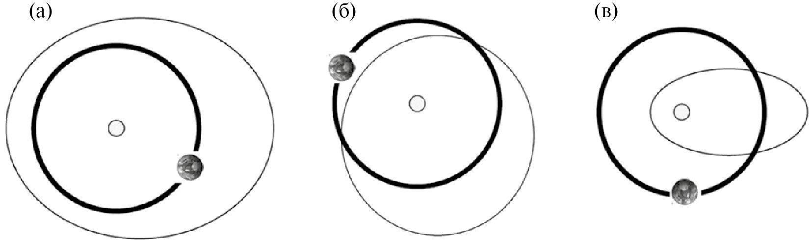 Рис. 3. Приблизительные орбиты астероидов: (а) – (1221) Амура; (б) – (1862) Аполлона; (в) – (2062) Атона. Орбита Земли обозначена жирной линией.