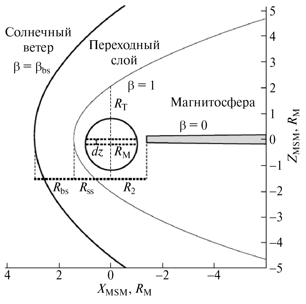 Параболоидная модель поля магнитосферы Меркурия определяется следующими параметрами: 1) – расстояние от центра Меркурия до подсолнечной точки на магнитопаузе; 2) – расстояние от центра планеты до внутреннего края токового слоя хвоста магнитосферы; 3) – магнитное поле диполя на экваторе Меркурия; 4) величина магнитного поля токового слоя хвоста магнитосферы на его внутреннем крае – , где ; 5) – угол наклона между направлением магнитного диполя и направлением , хотя в данной работе для простоты предполагалось, что в первом приближении диполь не имеет угла наклона; 6) – смещение токового слоя хвоста относительно магнитной экваториальной плоскости; 7) – часть проникающего в магнитосферу межпланетного магнитного поля , задаваемого как , где – коэффициент проникновения ММП в магнитосферу Меркурия. На рис. 1 представлена схема, иллюстрирующая основные параметры параболоидной модели магнитосферы Меркурия.