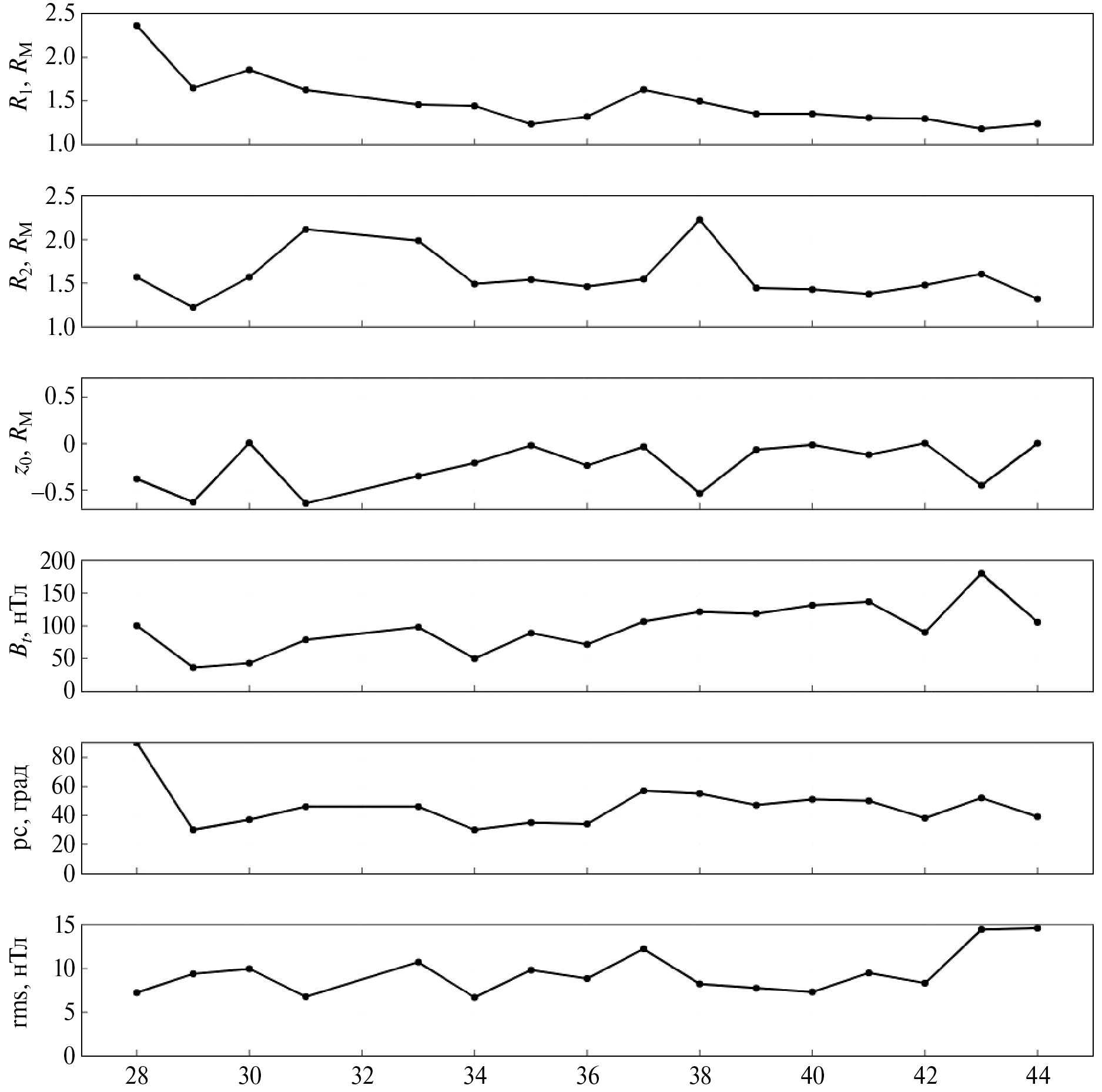 Рис. 3. Рассчитанные параметры параболоидной модели магнитосферы Меркурия с 28-го по 44-й витки КА MESSENGER. По оси абсцисс указан номер витка, по оси ординат – величины расстояния до подсолнечной точки , расстояния до хвоста магнитопаузы , смещения токового слоя хвоста относительно магнитной экваториальной плоскости , величины модуля магнитного поля на переднем краю токового слоя хвоста , границы полярной шапки и невязки .
